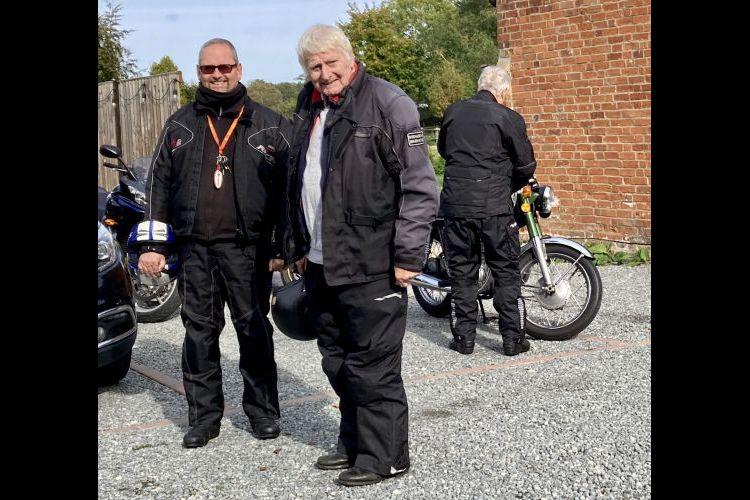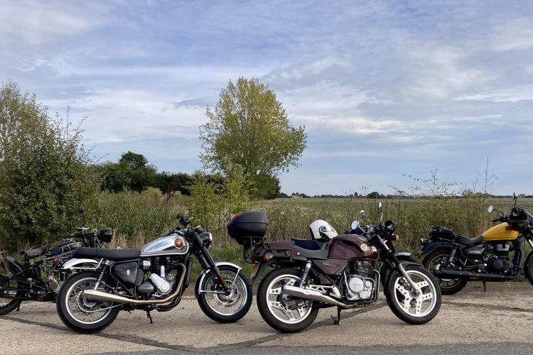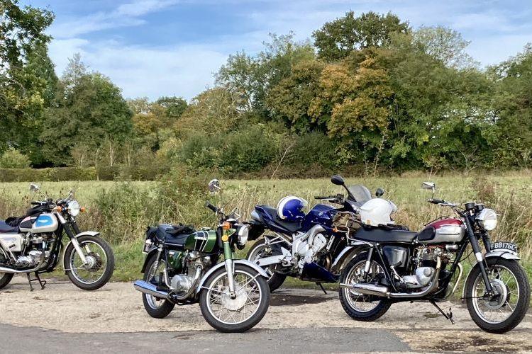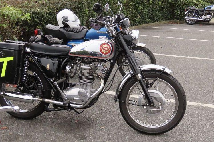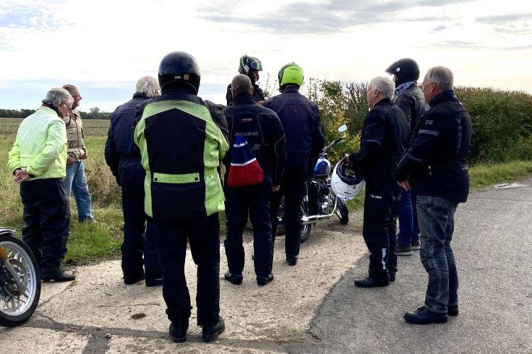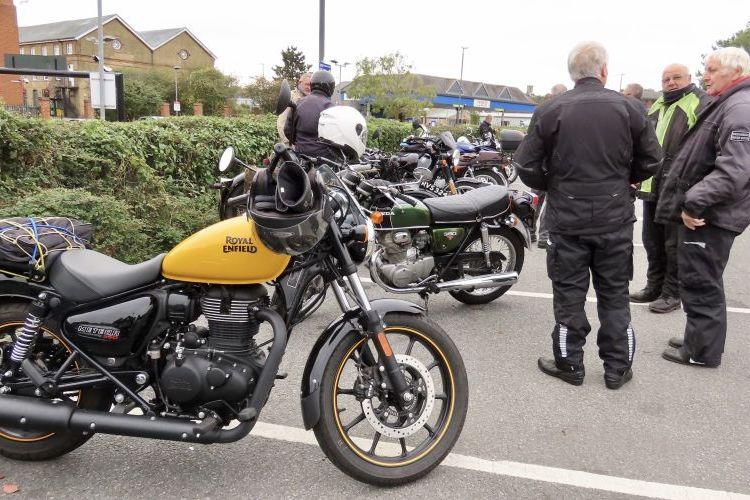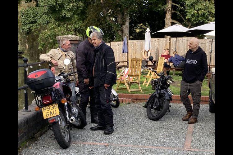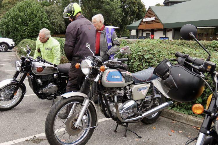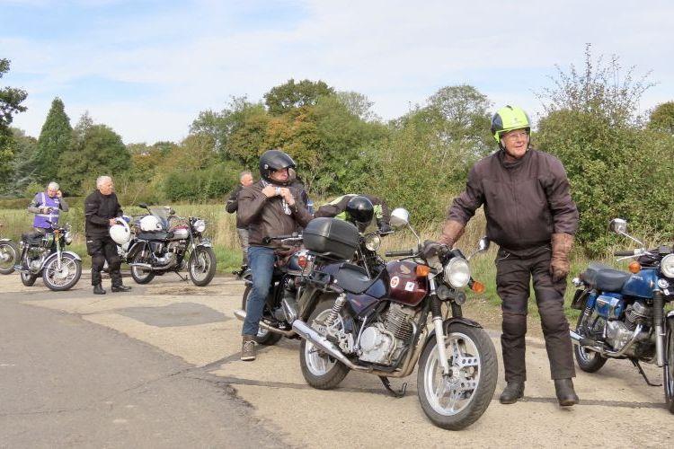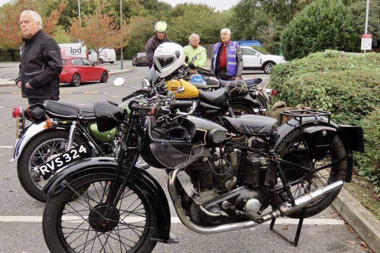 "I couldn't see a ride go to waste so I hastily plotted a route for today (13/10.) A mere 40 miles planned. Lovely day and 12 riders turned at Tesco not for shopping I might add. The fun started when Paul Weston's 1930 Sunbeam started with an enormous bang which blew the exhaust pipe and silencer apart. Followed some banging and a kick or two, as recommended by Haynes manual, and we're good to go. Another non starter was Andy Hanlon who's pretty B25 snapped a cable. We did the decent thing and abandoned Andy in the car park, (that's what mates are for).
